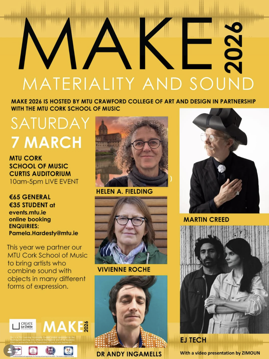 MATERIALITY AND SOUND features speakers who will discuss the role of sound in art practice, bringing sculptors who reference or integrate sound and/or collaborate with musicians, or who orchestrate humble materials into soundscapes, or who embed sound digitally into material. This is our twelfth MAKE Symposium and it is wonderful this year to partner with our MTU Cork School of Music!